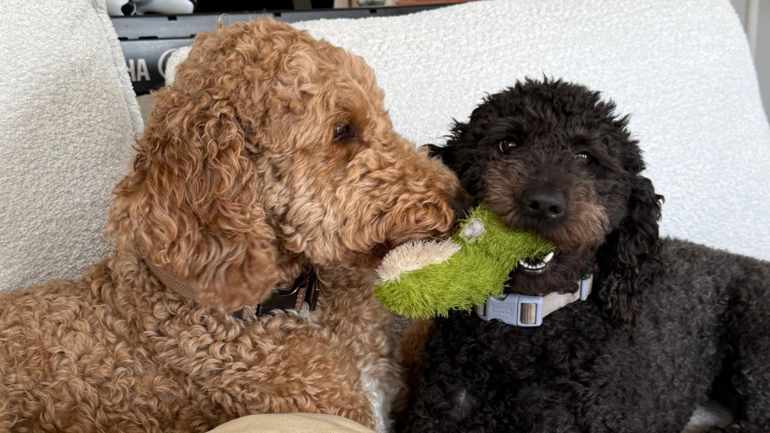 We have two dogs named Moby and Maevie, they are both crazy, love sleep, and are easily the best dogs in the world. They are both poodles, Moby loves every person he sees, Maevie does not.